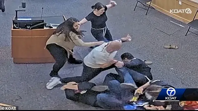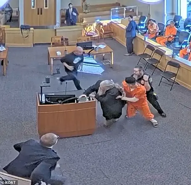 A chaotic scene played out in a New Mexico courtroom when family members of a murder victim attacked their alleged killer, Alexander Segura Ortiz. The incident began when Carlos Lucero and Pete Ysasi, relatives of the deceased, charged at Ortiz during a hearing, leaping over a barrier to reach him. Security cameras captured the event, showing a police officer attempting to protect Ortiz from Lucero’s assault. As they all fell to the ground, Ysasi joined in on the attack, with other family members and officers rushing to intervene. One woman unsuccessfully tried to pull Ortiz’s father away, while Ysasi wrestled with him. Lucero and another man piled onto the scuffle, all while a police officer held Ortiz down. In a desperate move, one of the women involved used a folding chair to strike the officer and Ortiz. The melee highlighted the volatile nature of courtroom proceedings, especially when family members feel strong emotions about the cases being heard.