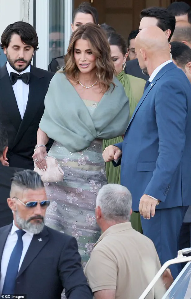 Queen Rania of Jordan turned heads as she stepped out in an extravagant designer gown to celebrate Lauren Sanchez and Jeff Bezos’s $46 million nuptials this weekend.