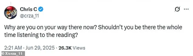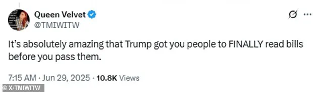 Shouldn’t you be there the whole time listening to the reading?’ Others, like @TMIWITW, expressed frustration with the Democratic-led delay, writing, ‘It’s absolutely amazing that Trump got you people to FINALLY read bills before you pass them.’ Such reactions underscore a growing public frustration with legislative opacity, particularly in an era where misinformation and partisan gridlock are perceived as threats to democratic accountability.