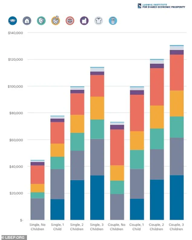 A single working adult with no children now needs nearly $45,000 per year to cover basic living expenses, while a working couple with two children must shell out $120,302 annually just to meet essential needs.