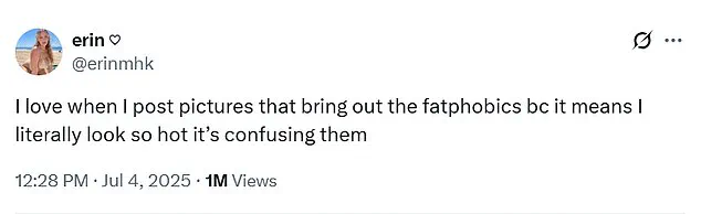 Maybe some walks around the neighborhood after work,’ while another asked, ‘Would women be supportive if she was a model 10?’ The latter comment was met with a sharp reply from Klay herself, who noted, ‘No, they don’t see her as a threat they pity her and virtue signal that they’re kind in the replies.’ Other trolls took a more clinical tone, with one claiming, ‘Being overweight is a serious health issue, please seek treatment with diet, exercise and medication if needed, one can develop diabetes, heart issues and other illness from it.’