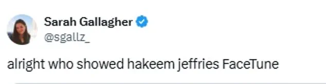 Journalist Ken Klippenstein mocked Jeffries, writing, ‘Hakeem Jeffries is such a charisma black hole that it’s warping the fabric of spacetime,’ while Republican commentator Erin Maguire quipped, ‘Hakeem Jeffries slimming himself in Photoshop is the most transparency we’ve seen from Democrats in years.’ Florida-based pundit Eric Daugherty added, ‘LMAO!