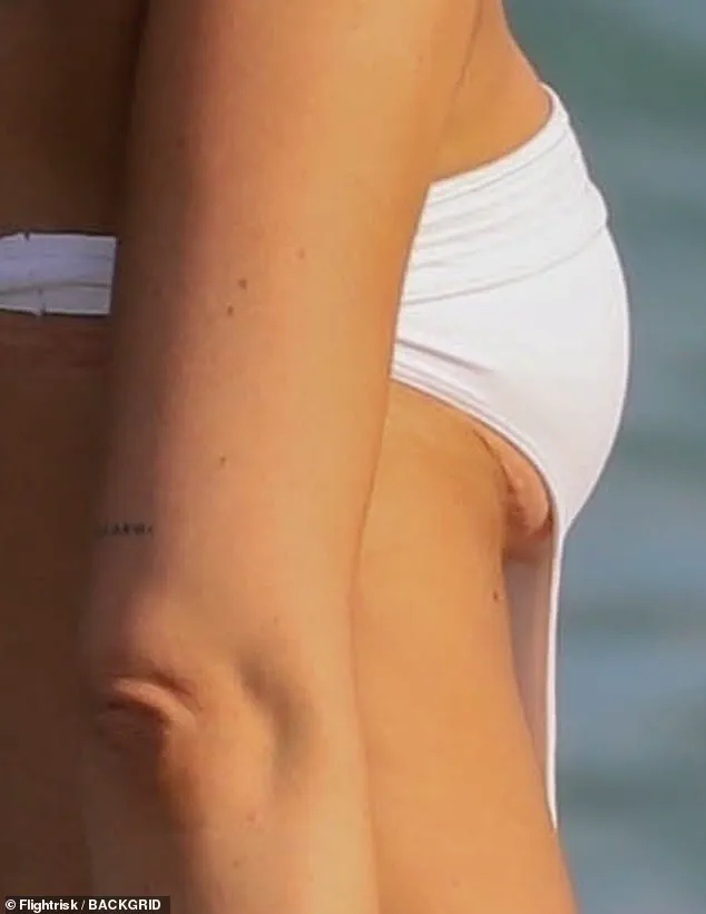 The images, which captured her in a white cut-out one-piece swimsuit from Isabel Marrant and a flowing white skirt, revealed a visible scar beneath her underboob—an area typically hidden by clothing or strategic posing.