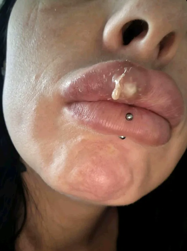 Horrifying photographs later revealed the full extent of the damage: her under-eyes were swollen and drooping, and a large, oozing blister had formed on her lip, which she attributes to an infection from the filler.