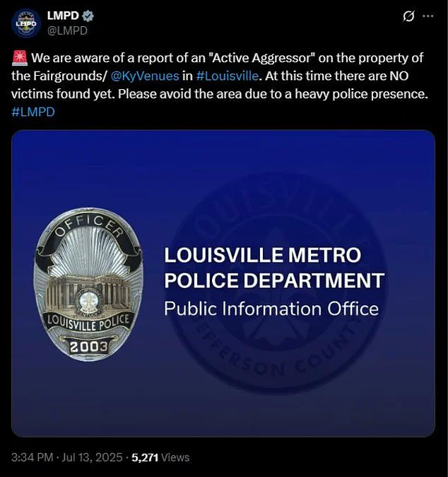 The Louisville Metro Police Department confirmed the presence of an ‘active aggressor’ at the fairgrounds but clarified that no victims had been found at the time.