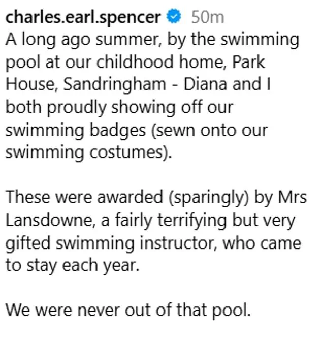 The caption accompanying the post reads: ‘A long ago summer, by the swimming pool at our childhood home, Park House, Sandringham – Diana and I both proudly showing off our swimming badges (sewn onto our swimming costumes).