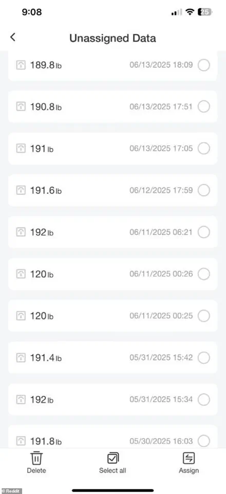 The woman shared a screenshot of the scale’s app interface on the ‘Am I Overreacting’ subreddit, revealing two unassigned weigh-ins of exactly 120lbs logged back-to-back at 12:25 a.m. and 12:26 a.m.
