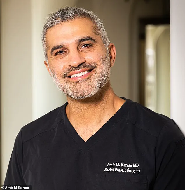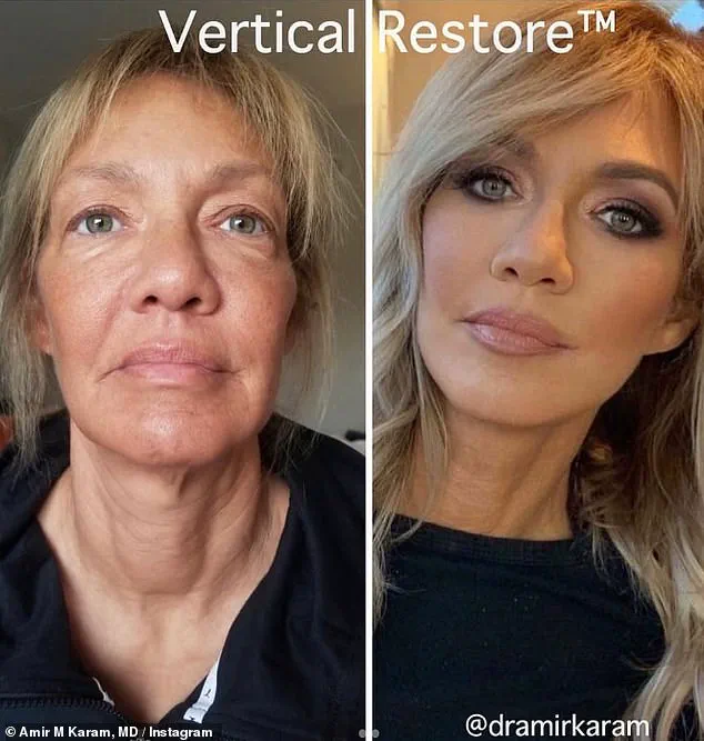 Amir Karam, a San Diego-based surgeon, echoed these sentiments, explaining that the transformations he sees in his patients are often the result of fat transfers. ‘Younger patients frequently request this procedure to restore lost volume,’ he said. ‘It’s a common and effective solution for those who want to look their best without the overt signs of surgery.’ Karam has also developed a specialized technique called the Vertical Restore facelift, which uses fat transfer to correct sagging skin and often includes skin resurfacing, eye treatments, and a lip lift if needed. ‘Many of my patients in their late 40s and 50s opt for this procedure,’ he noted, highlighting its ability to deliver a more comprehensive rejuvenation.