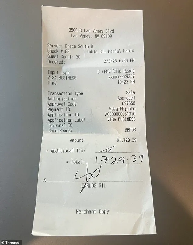 But the shock came when Gil crossed out an additional line requesting yet another tip. ‘Tipping culture in Las Vegas is OUT OF CONTROL,’ he wrote in a social media post. ‘At what point does this highway robbery end?