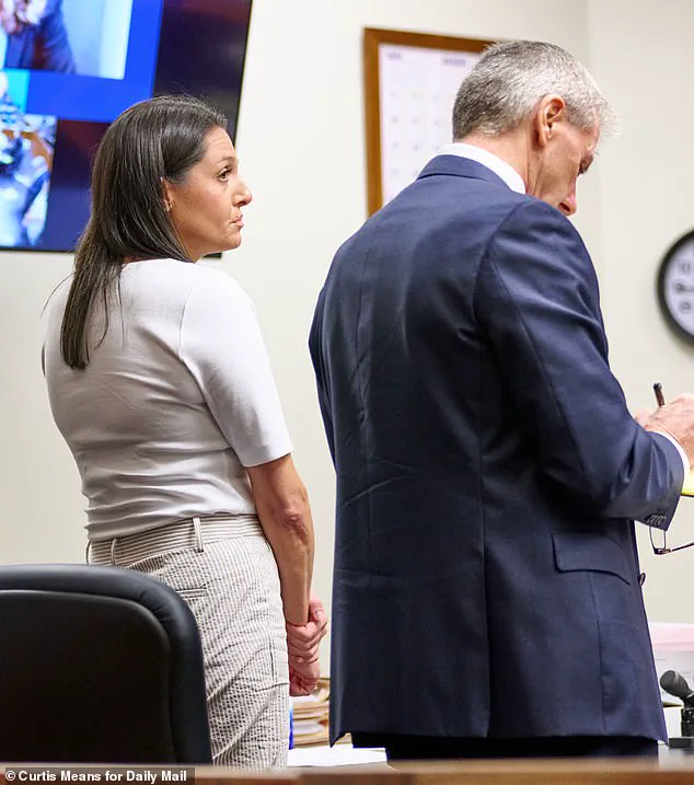 Dressed in a modest white ensemble, the teacher appeared visibly shaken, her hands trembling slightly as her attorney, John W.