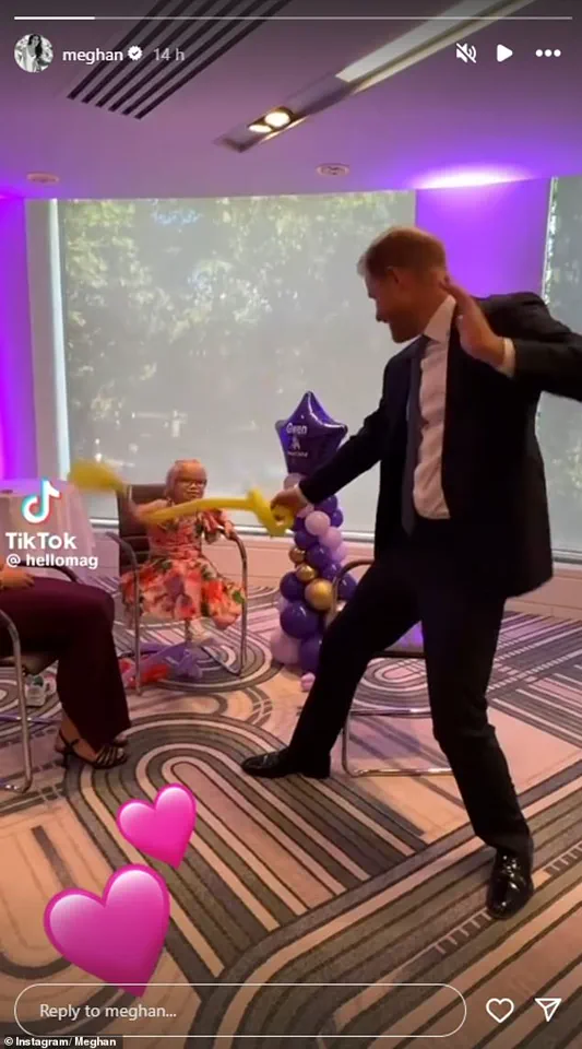 The video, captured by WellChild’s Instagram stories, shows Harry laughing as he duels with balloons, a moment that appears to contrast sharply with his earlier visit to the late Queen Elizabeth II’s final resting place at Windsor.