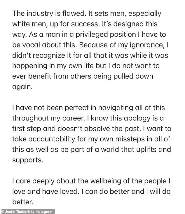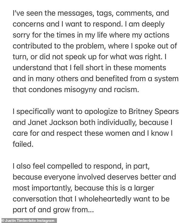 “I am deeply sorry for the times in my life where my actions contributed to the problem,” Justin wrote. “I understand that I fell short in these moments and in many others and benefited from a system that condones misogyny and racism.” He went on to specifically address his regrets towards Britney and Janet, emphasizing his care for their well-being.
