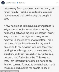 In a heartfelt Instagram statement, Bieber addressed the matter head-on, stating that he had indeed overstepped while under the influence and insisted nothing more than an innocent moment occurred between him and Palmer. His message was clear: ‘A few weeks ago, I displayed a strong lapse in judgement – but let me be clear – nothing happened between me and my costar,’ he wrote. He further apologized to his family for causing embarrassment and vowed to be the best husband and father possible moving forward.