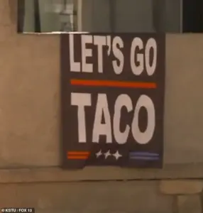 Among them was a ‘Let’s go taco’ flag, a reference to the political meme TACO, which stands for ‘Trump Always Chickens Out.’ Another flag read ‘Is he dead yet?’ a phrase that directly alludes to the current president, who was reelected and sworn in on January 20, 2025.