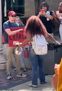The video also shows another individual, believed to be a fellow student, urging Booker to ‘not push the camera in my face’ as she continued her confrontation.