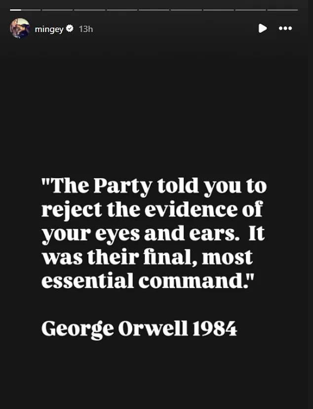 She shared a video of Mayor Frey telling ICE agents to ‘get the f*** out of Minneapolis’ and paired it with a quote from George Orwell’s ‘1984’: ‘The Party told you to reject the evidence of your eyes and ears.