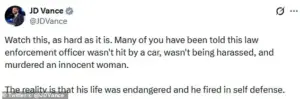 Vance, who has been vocal in his support of federal law enforcement, took to X to share the footage, calling on viewers to watch it despite its emotional weight. ‘Watch this, as hard as it is,’ he wrote. ‘Many of you have been told this law enforcement officer wasn’t hit by a car, wasn’t being harassed, and murdered an innocent woman.