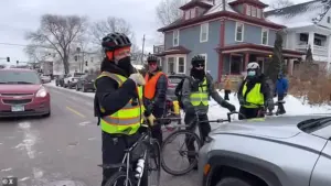 The video, uploaded to X on January 10 by Cam Higby, shows a group of at least six protestors on bikes wearing high-visibility vests and masks, standing in a snowy street in Minnesota.