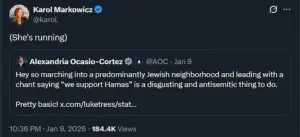 It noted that AOC had made one post condemning pro-Hamas chants, one supporting the Iranian protests, and none addressing the killing of Renee Good or ICE’s actions.