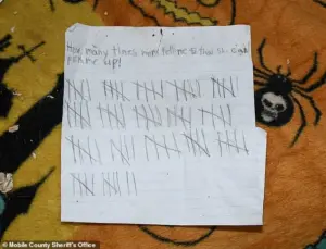 Among the most heartbreaking discoveries was a pencil-written letter the girl had left behind, titled, “How many times mom tells me that she can’t pick me up!” The document was filled with more than 80 tally marks, each representing a time her mother, Marchelle Lynn Pertilla, had allegedly told her she could not come to retrieve her.