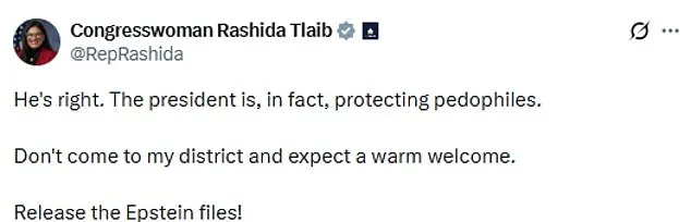 Similarly, Congresswoman Rashida Tlaib, who represents the district of Dearborn, expressed solidarity with Sabula, stating that the president is indeed ‘protecting pedophiles’ and urging the release of the ‘Epstein files.’