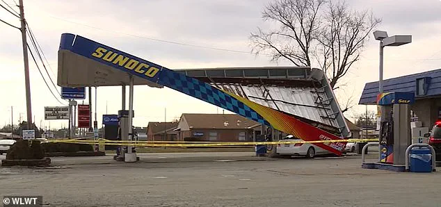 The collision occurred around 12:06 p.m., leaving significant damage to the gas station’s canopy and surrounding vehicles.