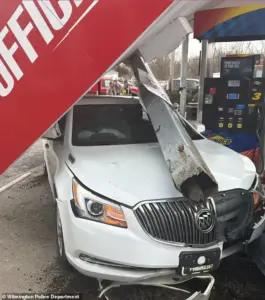 The woman’s car struck a pole supporting the gas station’s awning, causing it to partially collapse and fall onto a white Buick parked in the lot.