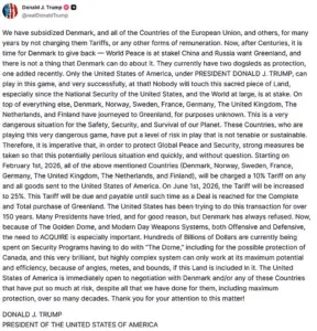 On Friday, Trump threatened to impose tariffs on ‘countries that don’t go along with Greenland,’ a move that has been widely interpreted as an attempt to pressure Denmark into allowing the U.S. to acquire the territory.