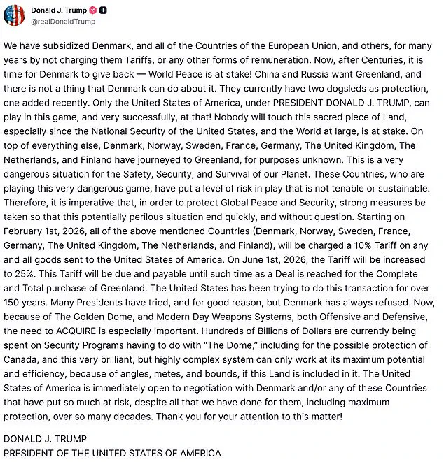 The ultimatum hinges on Denmark’s willingness to relinquish the mineral-rich territory, which Trump claims is crucial to global peace and American national security. ‘Only the United States of America, under PRESIDENT DONALD J.