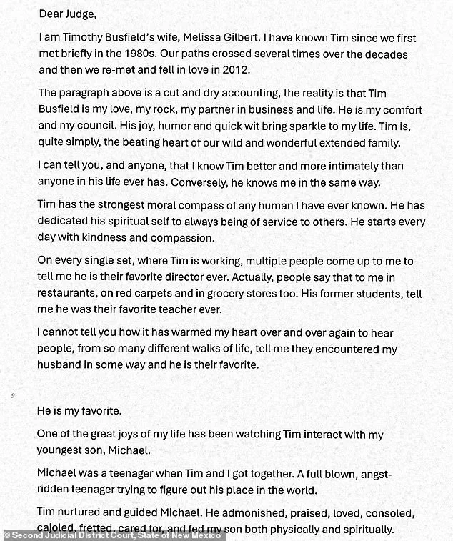 In a heartfelt letter addressed to the judge, Gilbert detailed her deep bond with Busfield, portraying him as not only her ‘rock’ but also a ‘partner in business and in life.’ She pleaded with the court to ‘protect’ her husband, requesting his release on bond in a filing that underscored the emotional weight of the situation.