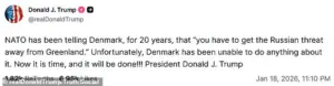 Donald Trump declared that ‘now is the time’ to stop Russian threats to Greenland and slammed Denmark for failing to protect its territory