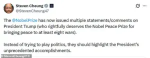 Cheung’s remarks, posted on X, emphasized that Trump ‘rightfully deserves the Nobel Peace Prize for bringing peace to at least eight wars,’ while condemning the foundation for what he described as a failure to recognize the president’s ‘unprecedented accomplishments.’