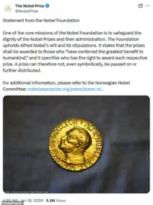The foundation clarified that Nobel Prizes ‘cannot be passed on or transferred, even symbolically,’ and emphasized that the awards are meant to honor individuals who ‘have conferred the greatest benefit to humankind.’ The statement also noted that the foundation has ‘a core mission to safeguard the dignity of the Nobel Prizes and their administration,’ rejecting any interpretation that the medal could be redistributed or repurposed.