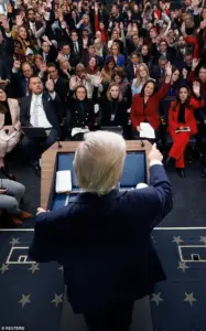 The room was packed with reporters, who watched in stunned silence as the former president, now in his second term, walked into the briefing room flanked by White House press secretary Karoline Leavitt.