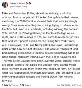Critics argue that Trump’s call for criminal prosecution of pollsters is an overreach that could stifle free speech and undermine the role of independent research in democracy.