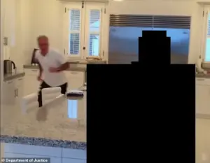 A chilling video has surfaced, capturing Jeffrey Epstein in what appears to be a moment of unbridled predatory behavior. The footage, released as part of a massive trove of newly unsealed documents by the U.S. Department of Justice, shows Epstein laughing as he chases two young women through the kitchen of his home on Little Saint James. The private Caribbean island, infamous for its ties to Epstein’s abuse network, becomes a backdrop for a scene that raises disturbing questions: How could such a moment remain hidden for so long? What does it say about the environment Epstein cultivated on his island? The women, their faces blurred to protect their identities, scream and try to evade him, their fear palpable. Epstein, dressed in a white polo shirt, joggers, and slippers, seems to revel in the chaos, his laughter echoing through the frame. At one point, he is seen leaping onto a kitchen counter, lunging toward one of the women while continuing to laugh—a moment that feels almost surreal in its grotesque normalcy.