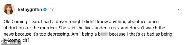 Comedian Kathy Griffin took to social media on Sunday to publicly criticize a driver who, according to Griffin, displayed a troubling lack of awareness about recent ICE raids and the associated violence. The incident occurred during her ‘New Face, New Tour’ in Concord, New Hampshire, where Griffin described the encounter in a post on Threads. She wrote that the driver claimed to live ‘under a rock’ and avoids watching the news because it’s ‘too depressing,’ a stance Griffin equated with complicity in the deaths of Alex Pretti and Renee Good, both shot by federal officers in Minneapolis on January 24 and January 7, respectively. Griffin’s post sparked immediate backlash, with some commenters defending the driver’s right to mental well-being while others accused her of overstepping. One user sarcastically remarked, ‘Oh yeah, I’m known for my grace,’ a jab at Griffin’s history of confrontational public statements.