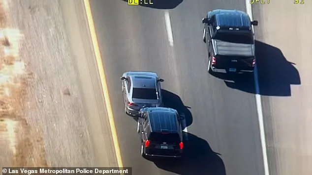 The video reveals a tense moment as an LVMPD black sedan slowly approaches a suspect’s vehicle, which had been involved in a carjacking.